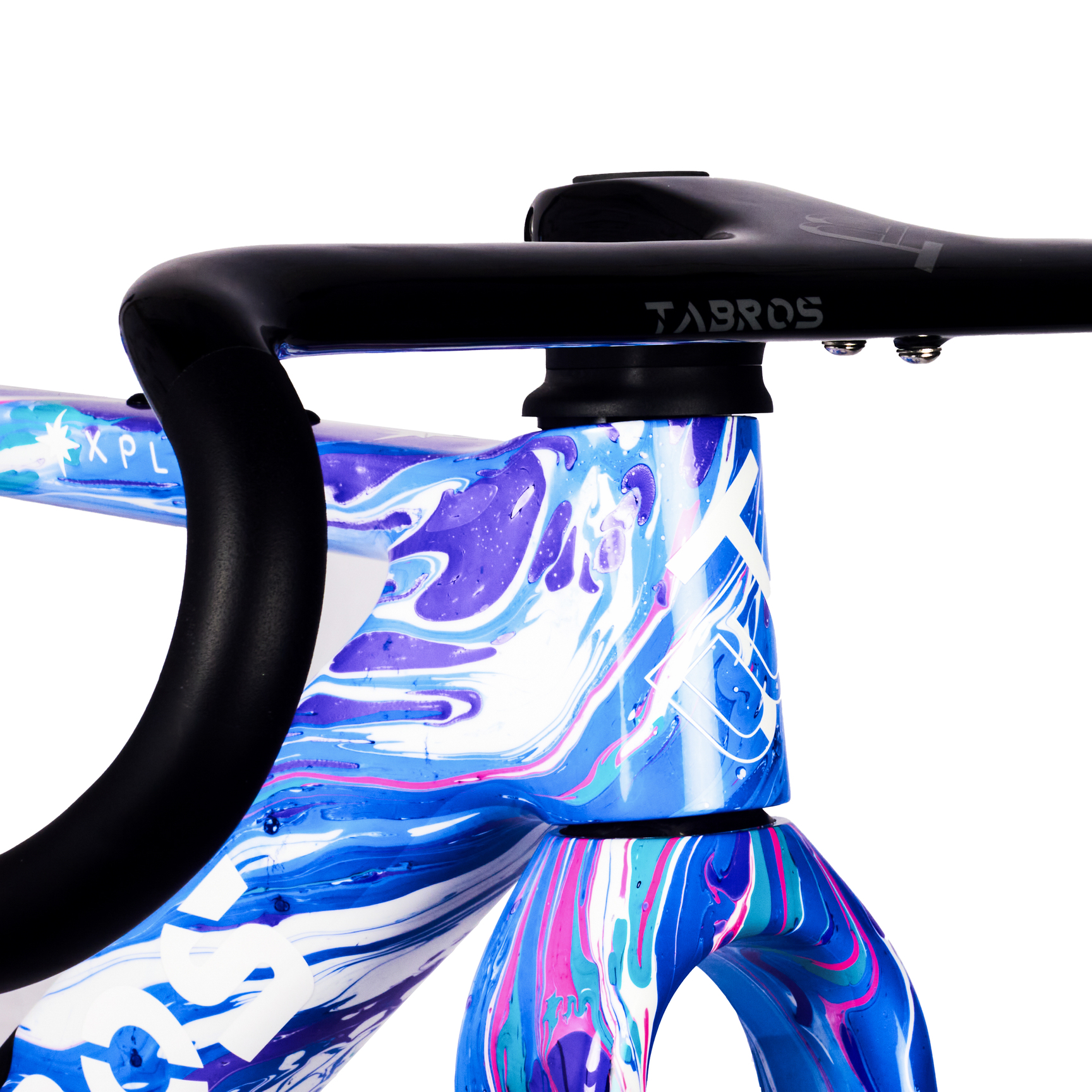 Il passaggio dei cavi completamente interno e il manubrio integrato in carbonio garantiscono un’estetica pulita e raffinata, senza compromettere rigidità e controllo.